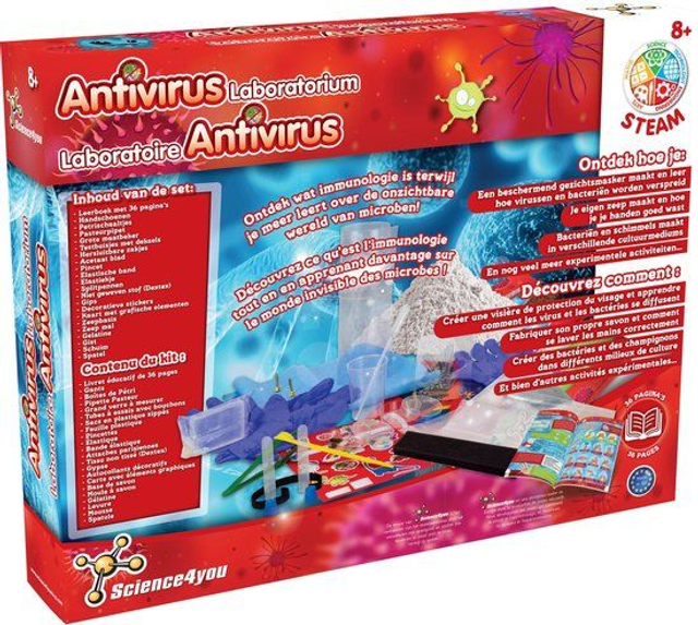 What actually is the virus? And a bacterium? And how big is it? Can we see them? Become a true scientist of microbiology and create your own experimental culture media to grow microbes and fungi! Learn what immunology is and how you can protect yourself against viruses, fungi and bacteria. Learn this and much more with this great antivirus kit! Brain Activator is the educational seal on all toys.What's in the box? Manual, gloves, petri dishes, Pasteur pipette, spatula, test tubes with lids, resealable bags, soap base, soap mold, gelatin, yeast, plaster, foam, elastic band, elastic band, acetate sheet, large measuring cup, detex, cotter pins, tweezers, card with graphic elements, decorative stickers. This Antivirus Laboratory Set has been developed to guide children in the discovery of microbiology, a very current topic! Fun guaranteed for everyone. Maybe even as a school project!