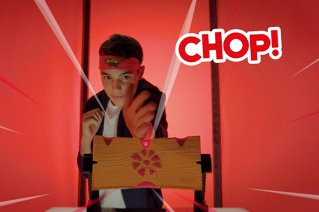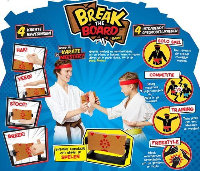 Word jij de nieuwe Karate Meester? Heb jij de beste karatevaardigheden om de lichten te hakken, vegen en stoten? De lampjes op de plank geven aan wat je moet doen, maar doe het snel en nauwkeurig, want alleen dan slaag je erin de plank te breken! Daag tot max. 9 tegenstanders uit: wie is de snelste? Of train jezelf met het bord op een standaard. Tien niveau's die steeds moeilijker worden! Je wordt aangemoedigd door je trainer. Maak verschillende bewegingen om de geluiden te mixen. Batterij informatie: 3 x AAA batterijen (meegeleverd). Afmeting spel: 27x7x17cm (lxbxh). Afmeting verpakking: 27x11x27cm (lxbxh). Leeftijdsindicatie: 6 jaar+.